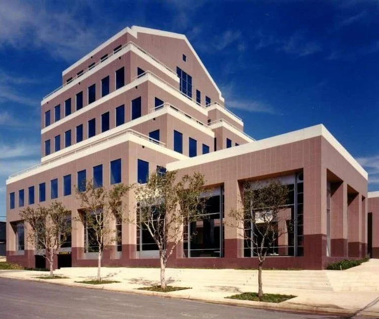 The Frost Financial Center master plan, on 4 city blocks in San Antonio, includes 3 office buildings, banking lobby, large plaza looking toward the River Walk, 2,000 car parking garage, and a 30 lane drive-in bank. Building cladding is granite on precast. Frank Key was project designer.